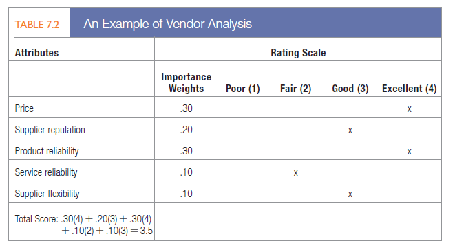 Before selecting a supplier, the buying center will specify and rank desired supplier attributes, often using a supplier-evaluation model such as the one in Table 7.2.
