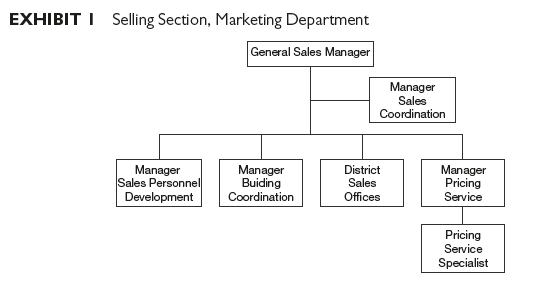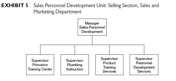 The Plumbing and Heating Division of Stanamer Corporation made and sold plumbing fixtures and fittings, hydronic heating and cooling equipment, food-waste disposals, water softeners, and invalid bath lifts. The largest of seven corporate divisions, it operated fourteen plants from coast to coast. Toward the end of the year the general sales manager, J. B. Samson, was analyzing a problem concerning an increase in the size of the sales force. (See Exhibit 1 for Selling Section organization.) The budget for the next year provided funds for adding fifteen salespeople, and Samson compared two alternatives: (1) hiring sales personnel with previous sales experience in the field and (2) following the company traditional practice of hiring and training inexperienced persons.