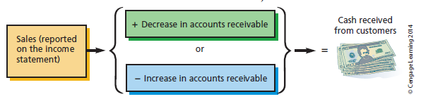 The increase of $9,000 in accounts receivable (shown in Exhibit 3) during 2014 indicates that sales on account exceeded cash received from customers by $9,000. In other words, sales include $9,000 that did not result in a cash inflow during the year. Thus, $9,000 is deducted from sales to determine the cash received from customers.