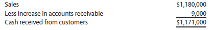 The income statement (shown in Exhibit 3) of Rundell Inc. reports sales of $1,180,000. To determine the cash received from customers, the $1,180,000 is adjusted for any increase or decrease in accounts receivable. The adjustment is summarized below.