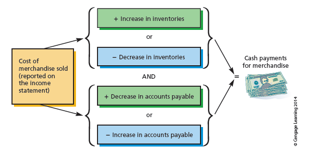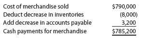 The income statement (shown in Exhibit 3) for Rundell Inc. reports cost of merchandise sold of $790,000. To determine the cash payments for merchandise, the $790,000 is adjusted for any increases or decreases in inventories and accounts payable. Assuming the accounts payable are owed to merchandise suppliers, the adjustment is summarized below.