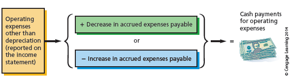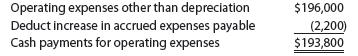 To determine the cash payments for operating expenses, the other operating expenses (excluding depreciation) of $196,000 ($203,000 – $7,000) are adjusted for any increase or decrease in accrued expenses payable. Assuming that the accrued expenses payable are all operating expenses, this adjustment is summarized below.