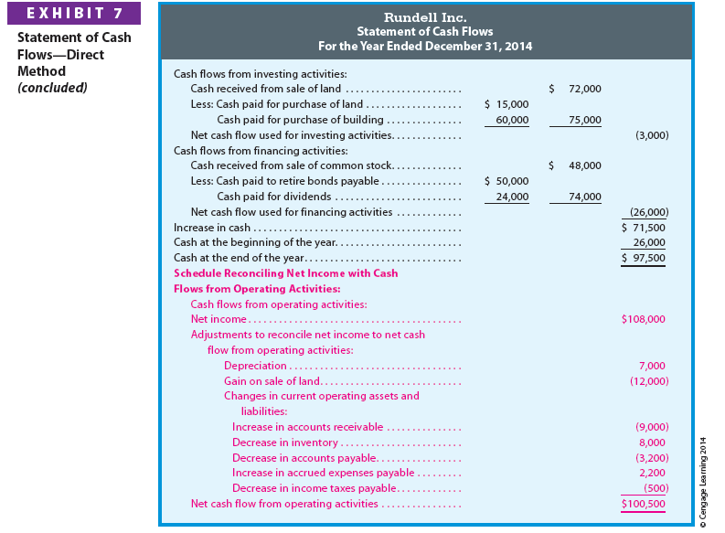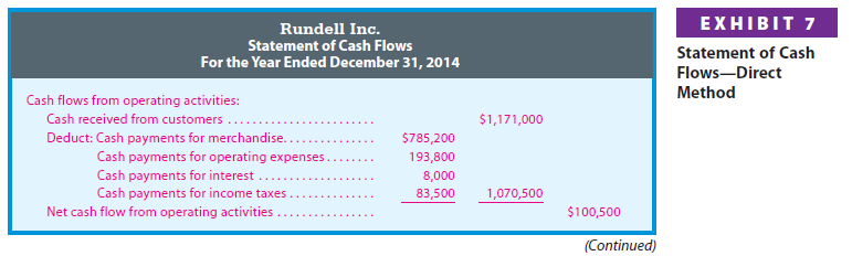 The statement of cash flows for Rundell Inc., using the direct method for reporting cash flows from operating activities, is shown in Exhibit 7. The portions of the statement that differ from those prepared under the indirect method are highlighted in color.