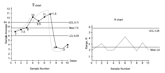 These control limits are marked on the graph paper on either side of the mean value (line). X and R values are plotted on the graph and jointed, thus resulting the control chart.