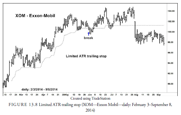 Another method of trailing stop designed to account for the intrinsic volatility of the security is to measure some fraction of the security’s ATR from its latest reversal point. This method is often called a “C handelier Exit.” For example, assume you are long a security rising on an accelerated trend that reaches a high of $50. The 14-day ATR for this stock is $2.50. Based on an evaluation of the market strength, you decide to place a stop three times the ATR below the recent highest high. (Usually a multiple of 2.5 to 4.0 times the ATR is used.) Therefore, you place a sell stop at $42.50. You don’t consider the trend line or the previous support level, which may be considerably below the current price. This method provides a stop based purely on the price and volatility of the security. When price rises above $50, the stop moves up with the price rise to three times its new ATR below the new high. Figure 13.8 shows what using a limited ATR trailing exit stop looks like. This stop is called a limited ATR trailing stop because under the rule of not allowing a stop to move against the prevailing trend, we have adjusted the pure ATR stop to not decline below a previous stop. Using this method reduces the likelihood that a false breakdown will occur because you are adjusting the stop for the security’s volatility. This method is especially useful when other levels such as a trend line or support level are considerably distant from the current price, and the security is following an accelerated upward trend whose end is difficult to predict.