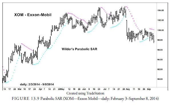 Another trend-following method for setting trailing stops is the parabolic SAR. (SAR stands for “stop and reverse.”) Developed by Welles Wilder (1978), it was initially intended as a trading system because it required a long or short position. However, it has become not only a breakout confirmation rule, but also an excellent, but sometimes sensitive, stop rule.