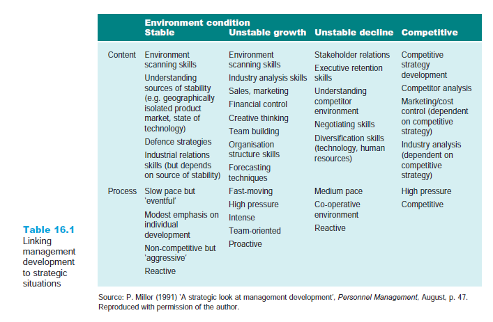 Those organisations that do consider HR development at a strategic level usually see it as a key to implementing business strategy in a reactive way. Luoma (2000) categorises this approach as a ‘needs-driven’ approach, where the purpose of the HR development strategy is to identify and remedy skill deficiencies in relation to the organisational strategy. Luoma suggests that in many articles this is ‘implicitly referred to as the only way of managing strategic HRD’. Miller, for example, has demonstrated how management development can be aligned with the strategic positioning of the firm, and this can be seen as coming within the broad remit of such approaches as a needs-driven approach. He has produced a matrix demonstrating how development content and processes can reflect stable growth, unstable growth, unstable decline and competitive positions, as shown in Table 16.1. He offers the model as suggestive, only, of the ‘possibilities in designing strategically-oriented management development programmes’.