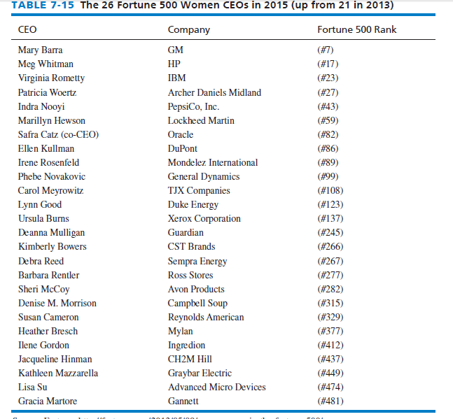 There is great room for improvement in removing the glass ceiling domestically, especially considering that women make up 47 percent of the U.S. labor force. Glass ceiling refers to the invisible barrier in many firms that bars women and minorities from top-level management positions. The United States is a leader globally in promoting women and minorities into mid- and top-level managerial positions in business. However, only 5.2 percent (26/500) of Fortune 500 firms have a woman CEO. Academic Research Capsule 7-2 reveals that women CEOs more often than men lead firms to be more philanthropic (giving). Table 7-15 gives the 26 Fortune 500 Women CEOs in 2015. These women are excellent role models for women globally.