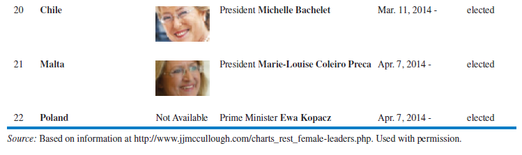 The percentage of women on corporate boards in Australia increased from 8.3 in 2010 to more than 16 percent in 2016.12 Malaysia and South Korea are also making excellent progress integrating women into upper levels of management and subsidizing companies that build childcare facilities and help women juggle work and family life. In contrast, women in India still are expected to care for their family and extended family; many women in India often have an abortion if they know their fetus is a girl. Overall, in Asia, women comprise only 6 percent of corporate board seats, compared to 17 percent in Europe and 15 percent in the United States. However, there are currently 24 countries globally with female presidents, chancellors, or prime ministers – the 22 pictured in Table 7-16, plus Switzerland (Simonetta Sommaruga) and Croatia (Kolinda Grabar-Kitarovic).