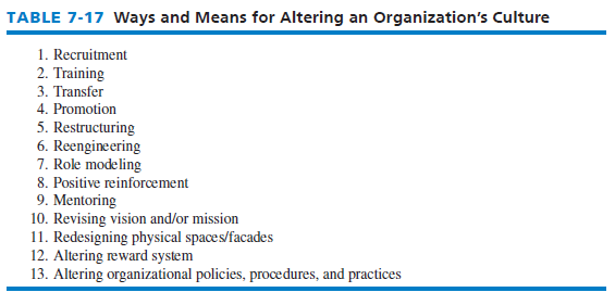 Strategists should strive to preserve, emphasize, and build on aspects of an existing culture that support proposed new strategies. aspects of an existing culture that are antagonistic to a proposed strategy should be identified and changed. Changing a firm’s culture to fit a new strategy is usually more effective than changing a strategy to fit an existing culture. As indicated in Table 7-17, numerous techniques are available to alter an organization’s culture, including recruitment, training, transfer, promotion, restructure of an organization’s design, role modeling, positive reinforcement, and mentoring.