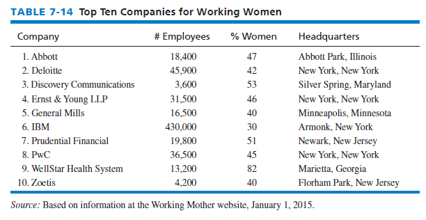 Working Mother magazine annually published its listing of “The 100 Best Companies for Working Mothers” (www.workingmother.com). Three especially important variables used in the ranking were availability of flextime, advancement opportunities, and equitable distribution of benefits. Other important criteria are compressed weeks, telecommuting, job sharing, childcare facilities, maternity leave for both parents, mentoring, career development, and promotion for women. Working Mother’s top 10 best companies for working women in 2014 are provided in Table 7-14. Working Mother also conducts extensive research to determine the best U.S. firms for women of color.