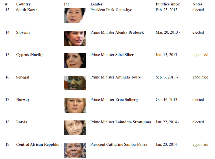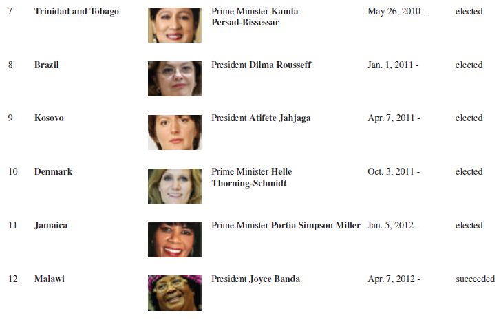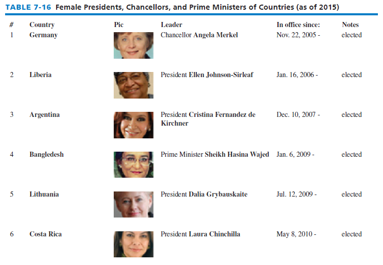 The percentage of women on corporate boards in Australia increased from 8.3 in 2010 to more than 16 percent in 2016.12 Malaysia and South Korea are also making excellent progress integrating women into upper levels of management and subsidizing companies that build childcare facilities and help women juggle work and family life. In contrast, women in India still are expected to care for their family and extended family; many women in India often have an abortion if they know their fetus is a girl. Overall, in Asia, women comprise only 6 percent of corporate board seats, compared to 17 percent in Europe and 15 percent in the United States. However, there are currently 24 countries globally with female presidents, chancellors, or prime ministers – the 22 pictured in Table 7-16, plus Switzerland (Simonetta Sommaruga) and Croatia (Kolinda Grabar-Kitarovic).