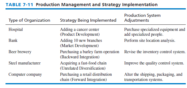 Examples of adjustments in production systems that could be required to implement various strategies are provided in Table 7-11 for both for-profit and nonprofit organizations. For instance, note that when a bank formulates and selects a strategy to add 10 new branches, a production-related implementation concern is site location. The largest bicycle company in the United States, Huffy, recently ended its own production of bikes and now contracts out those services to Asian and Mexican manufacturers. Huffy focuses instead on the design, marketing, and distribution of bikes, but it no longer produces bikes itself. The Dayton, Ohio, company closed its plants in ohio, Missouri, and Mississippi.