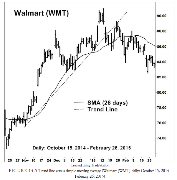 Second, the moving average often acts as support or resistance. As we have seen from Figure 14.5, a moving average often duplicates the trend line; therefore, it can be an easy trailing stop mechanism for determining when a position should be liquidated or reduced. In addition, prices seem to halt at the vicinity of moving averages. In Figure 14.5, for example, WMT halted its rally in late November at the moving average and again halted its decline at the moving average in early December.