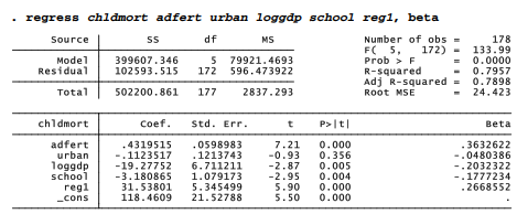 Child mortality, the strongest predictor of life expectancy, might be predicted from many of the same national characteristics. Adolescent fertility, which shows no significant effect on life expectancy in the regress or single-equation sem output above, turns out to be the strongest single predictor of child mortality.