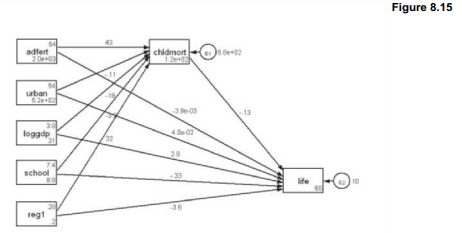 Within the box of each exogenous variable in Figure 8.15 we have the variable’s mean and its variance. Among the 178 nations used in this analysis, the mean adfert is approximately 54, and the variance is approximately 2.0e+03 = 2,000. The endogenous variable boxes contain their y- intercepts, such as 1.2e+02 = 120 for chldmort; again, compare with the previous regression results. Finally, Figure 8.15 gives residual variances associated with the error terms e1 (chldmort) and e2 (life).