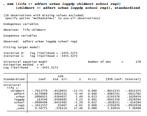 This section introduces Stata’s structural equation modeling command, sem, through a simple extension of our life expectancy regression. We have seen that life expectancy is predicted by other national characteristics. In the regression table below, the t statistics and beta weights or standardized regression coefficients (right-hand column) reveal that child mortality rate has by far the strongest effect.