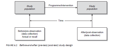 The before-and-after design overcomes the problem of retrospectively constructing the ‘before’ observation by establishing it before the intervention is introduced to the study population (see Figure 8.2). Then, when the programme has been completely implemented or is assumed to have had its effect on the population, the ‘after’ observation is carried out to ascertain the impact attributable to the intervention (see Figure 8.9).