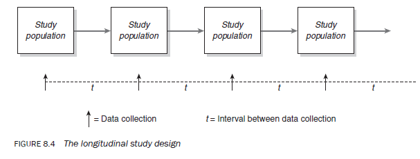 In longitudinal studies the study population is visited a number of times at regular intervals, usually over a long period, to collect the required information (see Figure 8.4). These intervals are not fixed so their length may vary from study to study. Intervals might be as short as a week or longer than a year. Irrespective of the size of the interval, the type of information gathered each time is identical. Although the data collected is from the same study population, it may or may not be from the same respondents. A longitudinal study can be seen as a series of repetitive cross-sectional studies.