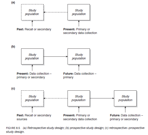 Retrospective studies investigate a phenomenon, situation, problem or issue that has happened in the past. They are usually conducted either on the basis of the data available for that period or on the basis of respondents’ recall of the situation (Figure 8.5a). For example, studies conducted on the following topics are classified as retrospective studies: