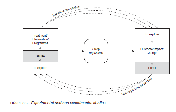 To understand the differences, let us consider some examples. Suppose you want to test the following: the impact of a particular teaching method on the level of comprehension of students; the effectiveness of a programme such as random breath testing on the level of road accidents; or the usefulness of a drug such as azidothymidine (AZT) in treating people who are HIV-positive; or imagine any similar situation in your own academic or professional field. In such situations there is assumed to be a cause-and-effect relationship. There are two ways of studying this relationship. The first involves the researcher (or someone else) introducing the intervention that is assumed to be the ‘cause’ of change, and waiting until it has produced — or has been given sufficient time to produce — the change. The second consists of the researcher observing a phenomenon and attempting to establish what caused it. In this instance the researcher starts from the effect(s) or outcome(s) and attempts to determine causation. If a relationship is studied in the first way, starting from the cause to establish the effects, it is classified as an experimental study. If the second path is followed — that is, starting from the effects to trace the cause – it is classified as a non-experimental study (see Figure 8.6).