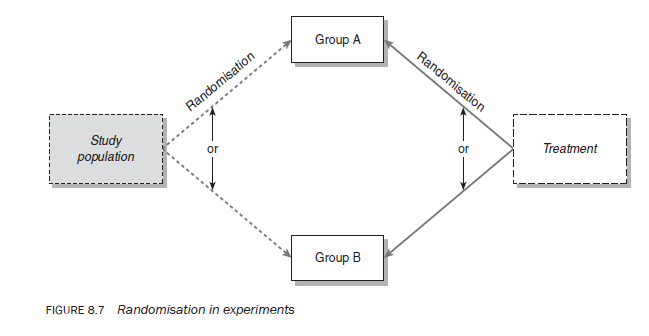 Experimental studies can be further classified on the basis of whether or not the study population is randomly assigned to different treatment groups. One of the biggest problems in comparable designs (those in which you compare two or more groups) is a lack of certainty that the different groups are in fact comparable in every respect except the treatment. The process of randomisation is designed to ensure that the groups are comparable. In a random design, the study population, the experimental treatments or both are not predetermined but randomly assigned (see Figure 8.7). Random assignment in experiments means that any individual or unit of a study population group has an equal and independent chance of becoming part of an experimental or control group or, in the case of multiple treatment modalities, any treatment has an equal and independent chance of being assigned to any of the population groups. It is important to note that the concept of randomisation can be applied to any of the experimental designs we discuss.