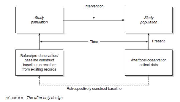 In an after-only design the researcher knows that a population is being, or has been, exposed to an intervention and wishes to study its impact on the population. In this design, information on baseline (pre-test or before observation) is usually ‘constructed’ on the basis of respondents’ recall of the situation before the intervention, or from information available in existing records — secondary sources (Figure 8.8). The change in the dependent variable is measured by the difference between the ‘before’ (baseline) and ‘after’ data sets. Technically, this is a very faulty design for measuring the impact of an intervention as there are no proper baseline data to compare the ‘after’ observation with. Therefore, one of the major problems of this design is that the two sets of data are not strictly comparable. For example, some of the changes in the dependent variable may be attributable to the difference in the way the two sets of data were compiled. Another problem with this design is that it measures total change, including change attributable to extraneous variables; hence, it cannot identify the net effect of an intervention. However, this design is widely used in impact assessment studies, as in real life many programmes operate without the benefit of a planned evaluation at the programme planning stage (though this is fast changing) in which case it is just not possible to follow the sequence strictly — collection of baseline information, implementation of the programme and then programme evaluation. An evaluator therefore has no choice but to adopt this design.