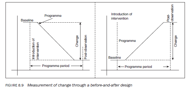 The main advantage of the before-and-after design (also known as the pre-test/post-test design) is that it can measure change in a situation, phenomenon, issue, problem or attitude. It is the most appropriate design for measuring the impact or effectiveness of a programme. A before-and-after design can be described as two sets of cross-sectional data collection points on the same population to find out the change in the phenomenon or variable(s) between two points in time. The change is measured by comparing the difference in the phenomenon or variable(s) before and after the intervention (see Figure 8.2).