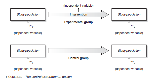 In a study utilising the control group design the researcher selects two population groups instead of one: a control group and an experimental group (Figure 8.10). These groups are expected to be comparable as far as possible in every respect except for the intervention (that is assumed to be the cause responsible for bringing about the change). The experimental group either receives or is exposed to the intervention, whereas the control group is not. Firstly, the ‘before’ observations are made on both groups at the same time. The experimental group is then exposed to the intervention. When it is assumed that the intervention has had an impact, an ‘after’ observation is made on both groups. Any difference in the ‘before’ and ‘after’ observations between the groups regarding the dependent variable(s) is attributed to the intervention.