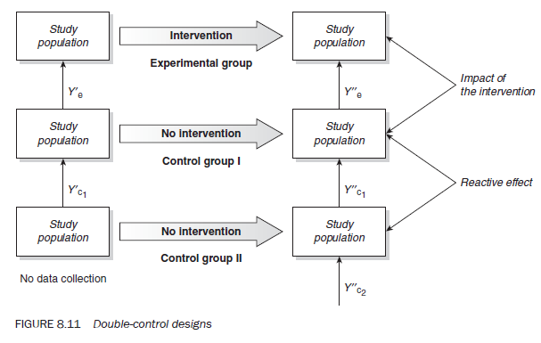 Although the control design helps you to quantify the impact that can be attributed to extraneous variables, it does not separate out other effects that may be due to the research instrument (such as the reactive effect) or respondents (such as the maturation or regression effects, or placebo effect). When you need to identify and separate out these effects, a doublecontrol design is required.