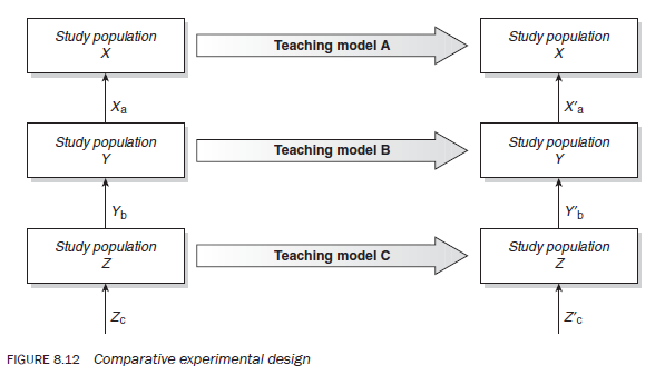 To illustrate this, imagine you want to compare the effectiveness of three teaching models (A, B and C) on the level of comprehension of students in a class (Figure 8.12). To undertake the study, you divide the class into three groups (X, Y and Z), through randomisation, to ensure their comparability. Before exposing these groups to the teaching models, you first establish the baseline for each group’s level of comprehension of the chosen subject.You then expose each group to a different teaching model to teach the chosen subject. Afterwards, you again measure the groups’ levels of comprehension of the material. Suppose Xa is the average level of comprehension of group X before the material is taught, and Xa‘ is this group’s average level of comprehension after the material is taught. The change in the level of comprehension, Xa‘ – Xa is therefore attributed to model A. Similarly, changes in group Y and Z, Yb‘ – Yb and Zc‘ – Zc, are attributed to teaching models B and C respectively. The changes in the average level of comprehension for the three groups are then compared to establish which teaching model is the most effective. (Note that extraneous variables will affect the level of comprehension in all groups equally, as they have been formed randomly.)