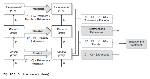 A patient’s belief that s/he is receiving treatment can play an important role in his/ her recovery from an illness even if treatment is ineffective. This psychological effect is known as the placebo effect. A placebo design attempts to determine the extent of this effect. A placebo study involves two or three groups, depending on whether or not the researcher wants to have a control group (Figure 8.13). If the researcher decides to have a control group, the first group receives the treatment, the second receives the placebo treatment and the third — the control group — receives nothing. The decision as to which group will be the treatment, the placebo or the control group can also be made through randomisation.