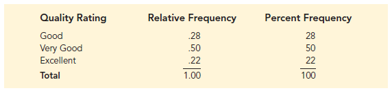 From the percent frequency distribution we see that 28% of the restaurants were rated good, 50% were rated very good, and 22% were rated excellent.