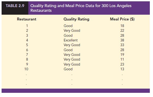 A crosstabulation is a tabular summary of data for two variables. Although both variables can be either categorical or quantitative, crosstabulations in which one variable is categorical and the other variable is quantitative are just as common. We will illustrate this latter case by considering the following application based on data from Zagat’s Restaurant Review. Data showing the quality rating and the typical meal price were collected for a sample of 300 restaurants in the Los Angeles area. Table 2.9 shows the data for the first 10 restaurants. Quality rating is a categorical variable with rating categories of good, very good, and excellent. Meal price is a quantitative variable that ranges from $10 to $49.