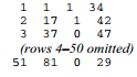 The first column values are case numbers (1, 2, 3, . . . , 51). The second column tells how many months elapsed after the diagnosis, before that person either developed symptoms of AIDS or the study ended (1, 17, 37, . . .). The third column holds a 1 if the individual developed AIDS symptoms (failure), or a 0 if no symptoms had appeared by the end of the study (censoring). The last column reports the individual’s age at the time of diagnosis.