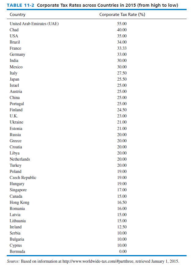 Tax rates in countries are important in strategic decisions regarding where to build manufacturing facilities or retail stores or even where to acquire other firms. High corporate tax rates deter investment in new factories and also provide strong incentives for corporations to avoid and evade taxes. Corporate tax rates vary considerably across countries and companies. As indicated in Table 11-2, the top national statutory corporate tax rates in 2015 among sample countries ranged from 0 percent in Bermuda to 55 percent in the United Arab Emirates (UAE). Note that some countries have a flat tax, which often, on adoption, triggers a surge in foreign direct investment. Signet Jewelers Ltd., owner of Kay’s Jewelers, Zale Corporation, and Jared the Galleria of Jewelry, is headquartered in Bermuda for a reason: zero corporate taxes.