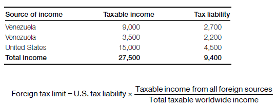 Example: Nicole, who is a U.S. resident, has a green card. She exports appliances (e.g., washers, dryers, stoves) to Venezuela and occasionally receives service fees for handling the maintenance and repairs at the clients’ locations in Caracas and Valencia. Last year, she received $9,000 in export revenues (taxable income) and $3,500 in service fees (taxable income). No foreign tax was imposed on Nicole’s export receipt of $9,000. However, she paid $2,200 in taxes to Venezuela on the service fees. Nicole also received $15,000 from her parttime teaching job at a community school (taxable income). Assume a 30 percent U.S. tax rate.