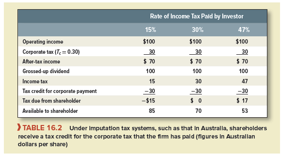 Of course, dividends are regularly paid by companies that operate under very different tax systems. In some countries, such as Australia and New Zealand, shareholders’ returns are not taxed twice. For example, in Australia shareholders are taxed on dividends, but they may deduct from this tax bill their share of the corporate tax that the company has paid. This is known as an imputation tax system. Table 16.2 shows how the imputation system works.