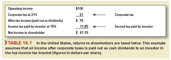 In the United States, shareholders’ returns are taxed twice. They are taxed at the corporate level (corporate tax) and in the hands of the shareholder (income tax or capital gains tax). These two tiers of tax are illustrated in Table 16.1, which shows the after-tax return to the shareholder if the company distributes all its income as dividends. We assume the company earns $100 a share before tax and therefore pays corporate tax of .21 x 100 = $21. This leaves $79 a share to be paid out as a dividend, which is then subject to a second layer of tax. For example, a shareholder who is taxed at 15% pays tax on this dividend of .15 x 79 = $11.85. Only a tax-exempt pension fund or charity would retain the full $79.