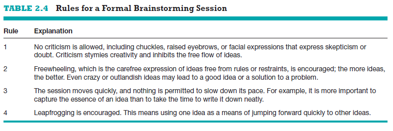 In a formal brainstorming session, the leader of the group asks the par- ticipants to share their ideas. One person shares an idea, another person reacts to it, another person reacts to the reaction, and so on. A flip chart or an electronic whiteboard is typically used to record all the ideas. A produc- tive session is freewheeling and lively. The session is not used for analysis or decision making—the ideas generated during a brainstorming session need to be filtered and analyzed, but this is done later. We show the four strict rules for conducting a formal brainstorming session in Table 2.4. As you’ll see, the number one rule for a brainstorming session is that no criticism is allowed, including chuckles, raised eyebrows, or facial expressions that express skepti- cism or doubt. Criticism stymies creativity and inhibits the free flow of ideas.