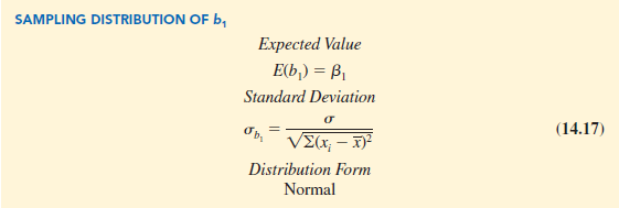 First, let us consider what would happen if we used a different random sample for the same regression study. For example, suppose that Armand’s Pizza Parlors used the sales records of a different sample of 10 restaurants. A regression analysis of this new sample might result in an estimated regression equation similar to our previous estimated regression equation y = 60 + 5x. However, it is doubtful that we would obtain exactly the same equation (with an intercept of exactly 60 and a slope of exactly 5). Indeed, b0 and b1, the least squares estimators, are sample statistics with their own sampling distributions. The properties of the sampling distribution of b1 follow.