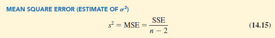 Every sum of squares has associated with it a number called its degrees of freedom. Statisticians have shown that SSE has n – 2 degrees of freedom because two parameters (β0 and β1) must be estimated to compute SSE. Thus, the mean square error is computed by dividing SSE by n – 2. MSE provides an unbiased estimator of σ2. Because the value of MSE provides an estimate of a2, the notation s2 is also used.