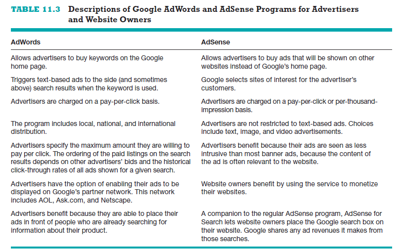 Along with engaging in hybrid promotional campaigns, many start-ups advertise in trade journals or utilize highly focused pay-per-click advertising provided by Google, Bing, or another online firm to economize the advertising dollars. Pay-per-click advertising represents a major innovation in advertising and has been embraced by firms of all sizes. Google has two pay-per-click pro- grams—AdWords and AdSense. AdWords allows an advertiser to buy keywords on Google’s home page (www.google.com), which triggers text-based ads to the side (and sometimes above) the search results when the keyword is used. So, if you type “soccer ball” into the Google search bar, you will see ads that have been paid for by companies that have soccer balls to sell. Many advertisers report impressive results utilizing this approach, presumably because they are able to place their ads in front of people who are already searching for in- formation about their product. Google’s other pay-per-click program is called AdSense. It is similar to AdWords, except the advertiser’s ads appear on other websites instead of Google’s home page. For example, an organization that pro- motes soccer might allow Google to place some of its client’s ads on its website. The advertiser pays on a pay-for-click basis when its ad is clicked on the soccer organization’s site. Google shares the revenue generated by the advertisers with the sponsoring site. Table 11.3 provides a summary of the Google AdWords and Google AdSense programs. Yahoo and Microsoft’s joint program, which is very similar to Google’s, is called the Yahoo Bing Network. The Yahoo Bing Network is a joint venture between Yahoo and Microsoft to sell pay-per-click ads on both the Yahoo and the Microsoft Bing search engines.