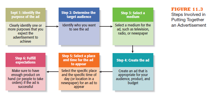 The steps involved in putting together an advertisement are shown in Figure 11.3. Typically, for start-up firms, advertisements are the most effective if they’re part of a coordinated marketing campaign.27 For example, a print ad might feature a product’s benefits and direct the reader to a website or Facebook page for more information. The website or Facebook page might offer access to coupons or other incentives if the visitor fills out an information request form (which asks for name, address, and phone number). The names collected from the information request form could then be used to make sales calls.