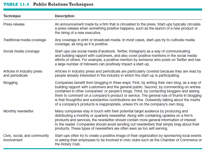 Public relations One of the most cost-effective ways to increase the awareness of the products a company sells is through public relations. Public relations refers to efforts to establish and maintain a company’s image with the public. The major difference between public relations and advertising is that public relations is not paid for directly. The cost of public relations to a firm is the effort it makes to network with journalists, blog authors, and other people to try to interest them in saying or writing good things about the com- pany and its products. Several techniques fit the definition of public relations, as shown in Table 11.4. Airbnb’s campaign to reach out to bloggers, chronicled in the “Savvy Entrepreneurial Firm” feature in this chapter, is an example of a public relations campaign.