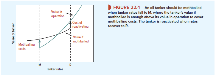 Companies are often faced with complex options that allow them to abandon a project temporarily—that is, to mothball it until conditions improve. Suppose you own an oil tanker operating in the short-term spot market. (In other words, you charter the tanker voyage by voyage, at whatever short-term charter rates prevail at the start of the voyage.) The tanker costs $50 million a year to operate, and at current tanker rates, it produces charter revenues of $52.5 million per year. The tanker is therefore profitable but scarcely cause for celebration. Now tanker rates dip by 10%, forcing revenues down to $47.5 million. Do you immediately lay off the crew and mothball the tanker until prices recover? The answer is clearly yes if the tanker operation can be turned on and off like a faucet. But that is unrealistic. There is a fixed cost to mothballing the tanker. You don’t want to incur this cost only to regret your decision next month if rates rebound to their earlier level. The higher the costs of mothballing and the more variable the level of charter rates, the greater the loss that you will be prepared to bear before you call it quits and lay up the boat.