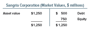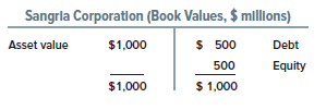 We calculated the market value of equity on Sangria’s balance sheet by multiplying its current stock price ($7.50) by 100 million, the number of its outstanding shares. The company’s future prospects are good, so the stock is trading above book value ($7.50 vs. $5.00 per share). However, interest rates have been stable since the firm’s debt was issued, so the book and market values of debt are, in this case, equal.