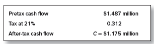 Sangria’s enologists have proposed investing $12.5 million in the construction of a perpetual crushing machine, which (conveniently for us) never depreciates and generates a perpetual stream of earnings and cash flow of $1.487 million per year pretax. The project is average risk, so we can use WACC. The after-tax cash flow is: