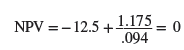 NPV = 0 means a barely acceptable investment. The annual cash flow of $1.175 million per year amounts to a 9.4% rate of return on investment (1.175/12.5 = .094), exactly equal to Sangria’s WACC.