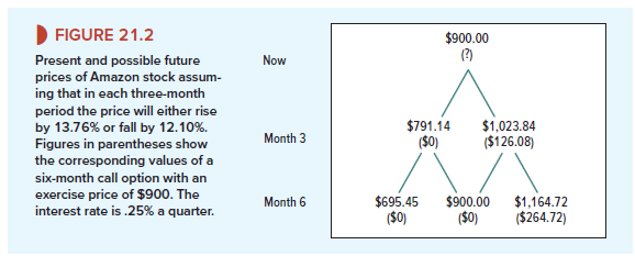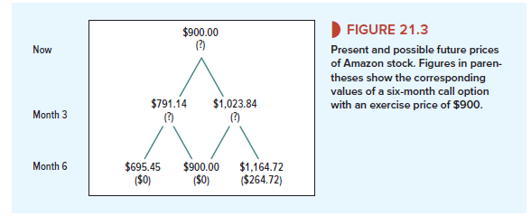 Figure 21.2 is taken from Figure 21.1 and shows the possible prices of Amazon stock, assuming that in each three-month period the price will either rise by 13.76% or fall by 12.10%.7 We show in parentheses the possible values at maturity of a six-month call option with an exercise price of $900. For example, if Amazon’s stock price turns out to be $695.45 in month 6, the call option will be worthless; at the other extreme, if the stock value is $1,164.72, the call will be worth $1,164.72 – $900 = $264.72. We haven’t worked out yet what the option will be worth before maturity, so we will just put question marks there for now.